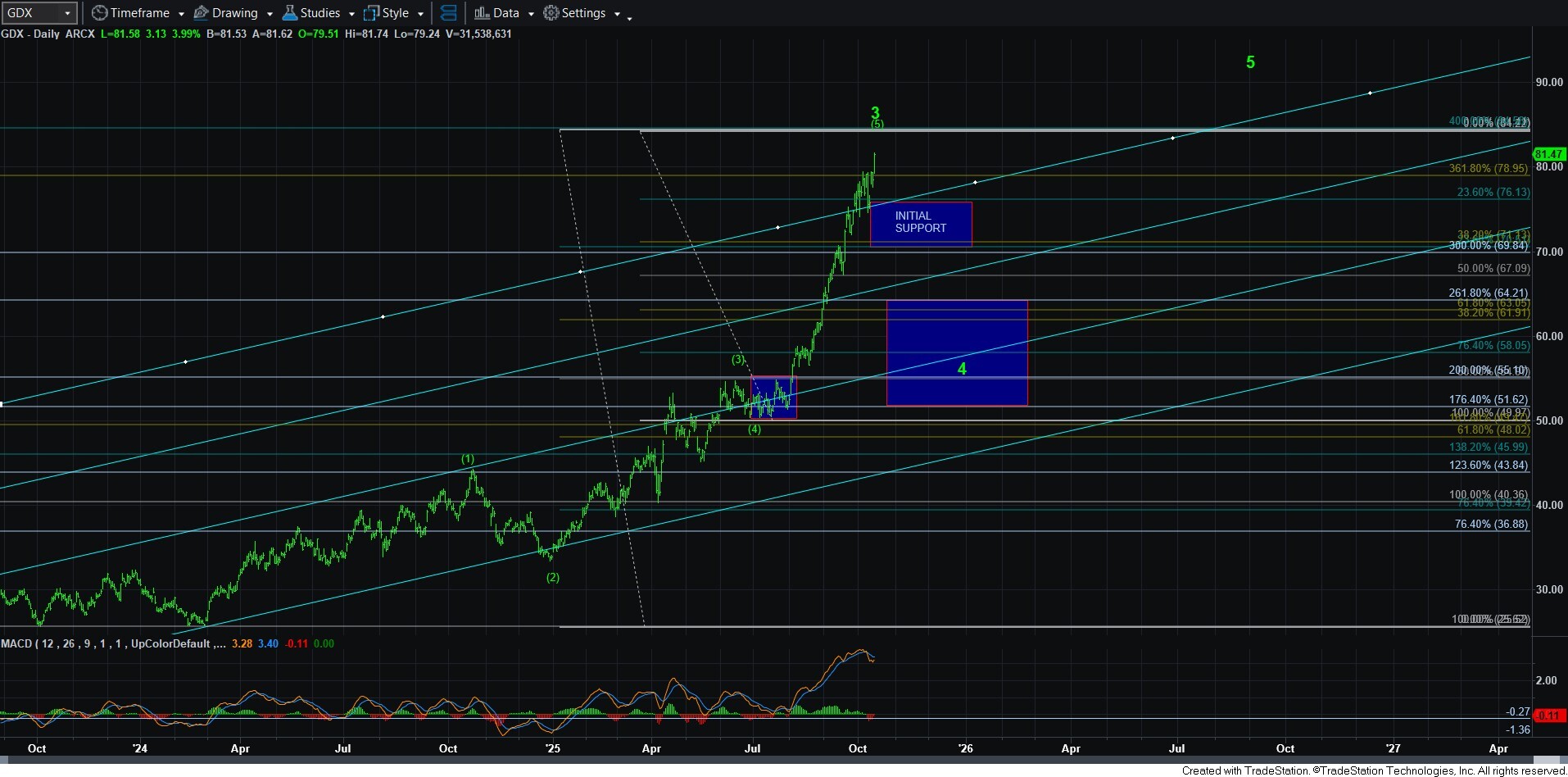 GDX would have to see a sustained break down below the 70 region to suggest that the larger degree wave 4 is in progress. And, if it was not for the GDX, I may be more strongly considering that this long-term cycle is coming to an end now. But, since I really cannot identify a reasonable 4th wave in this structure, it leaves me wanting for a 4-5 before this long-term cycle completes.