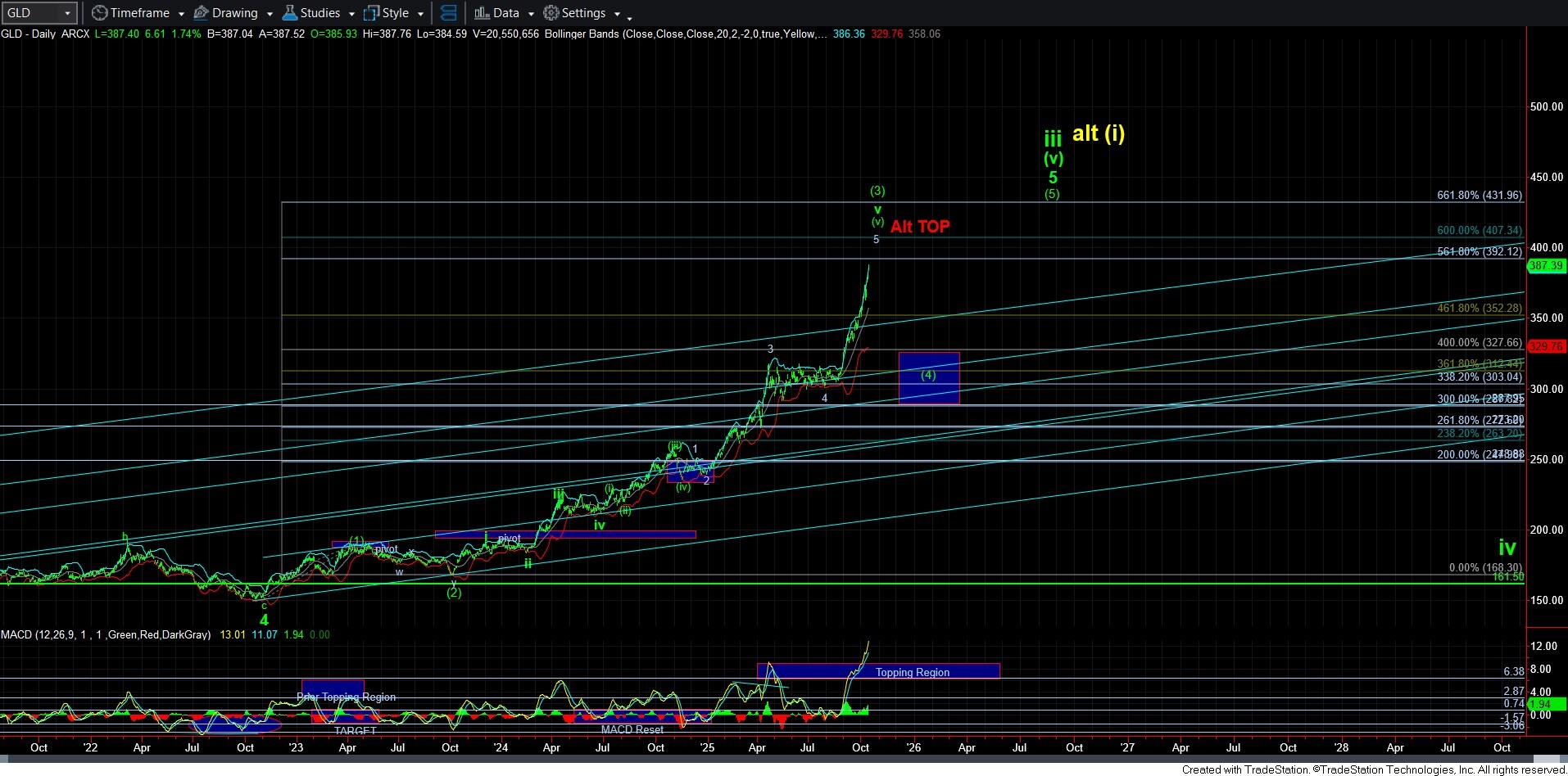 At this point in time, I would say we are well overdue for a 4th wave pullback. In fact, there is even some evidence that has developed that suggests this could be the final top we are creating in the metals complex as a whole. When I look at the MACD on the daily GLD chart, this is more typical of the blow off final top one would expect in gold. But, my primary analysis (for now) still maintains that we should see a 4th wave followed by a 5th wave before this long-term cycle completes.