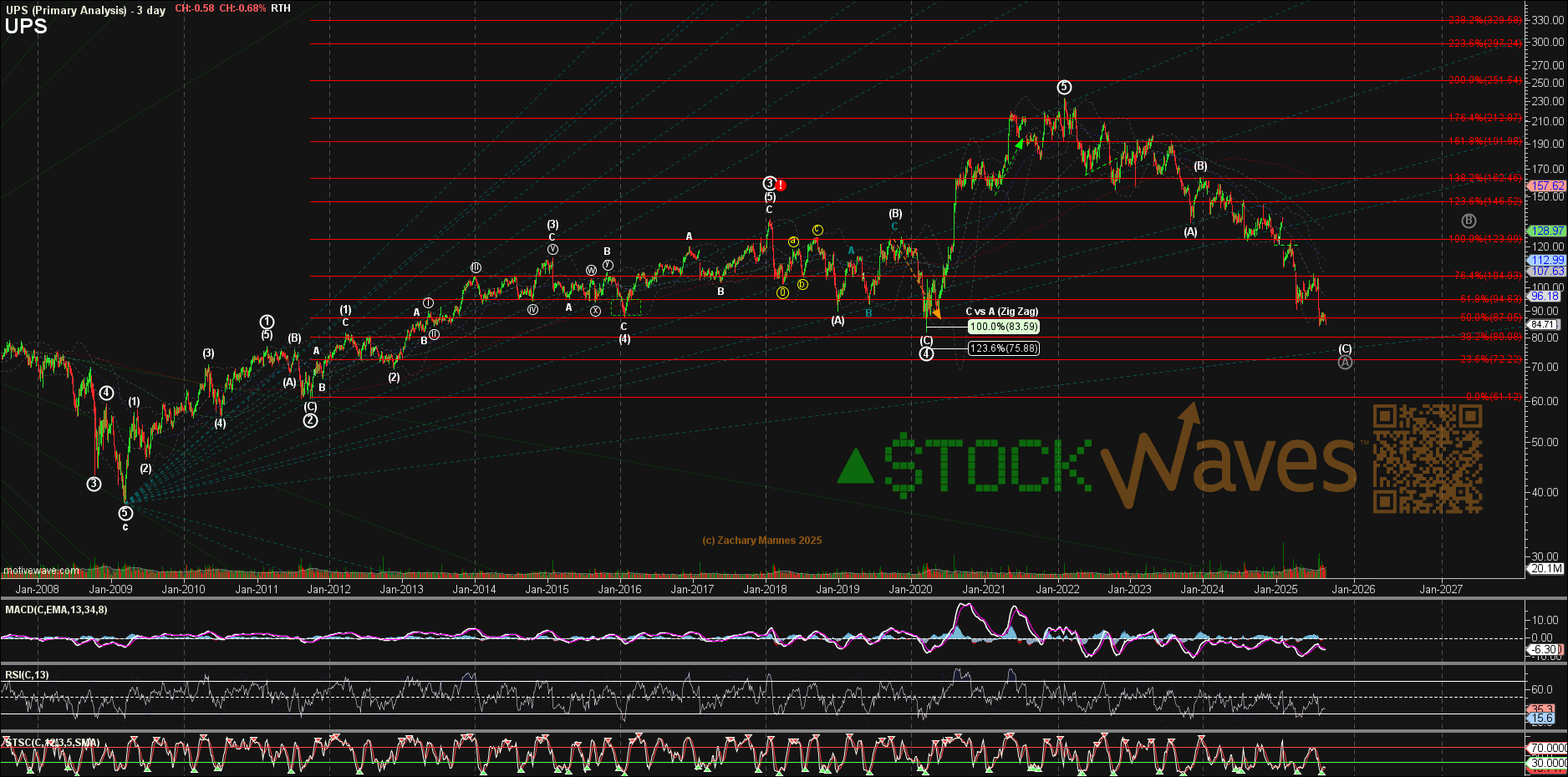 Should price find a low here in this $80 area then the next near term resistance to conquer would be first at $93 and then $102. UPS may be ready to deliver some alpha — ironically, a dividend cut could be the catalyst that marks the sentiment low and sets up the next rally.