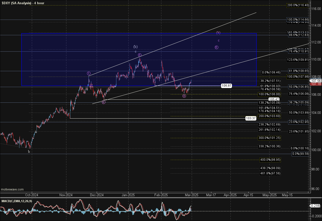 As I noted last week while this pattern still would look better with another higher high in the form of an ending diagonal to finish off the wave c of the larger wave (b), the break of the lower end of the trend channel and upper support which had come in at the 106.97 level, is making this count less probable at this point in time. With that being said however I still cannot fully rule out a final push higher as long as we remain over upper support. The next level of support remains at the 105.42 level. If we can manage to hold that level and then move back over the 108.60 level then it would still leave the door open to seeing the final push higher per the purple count.