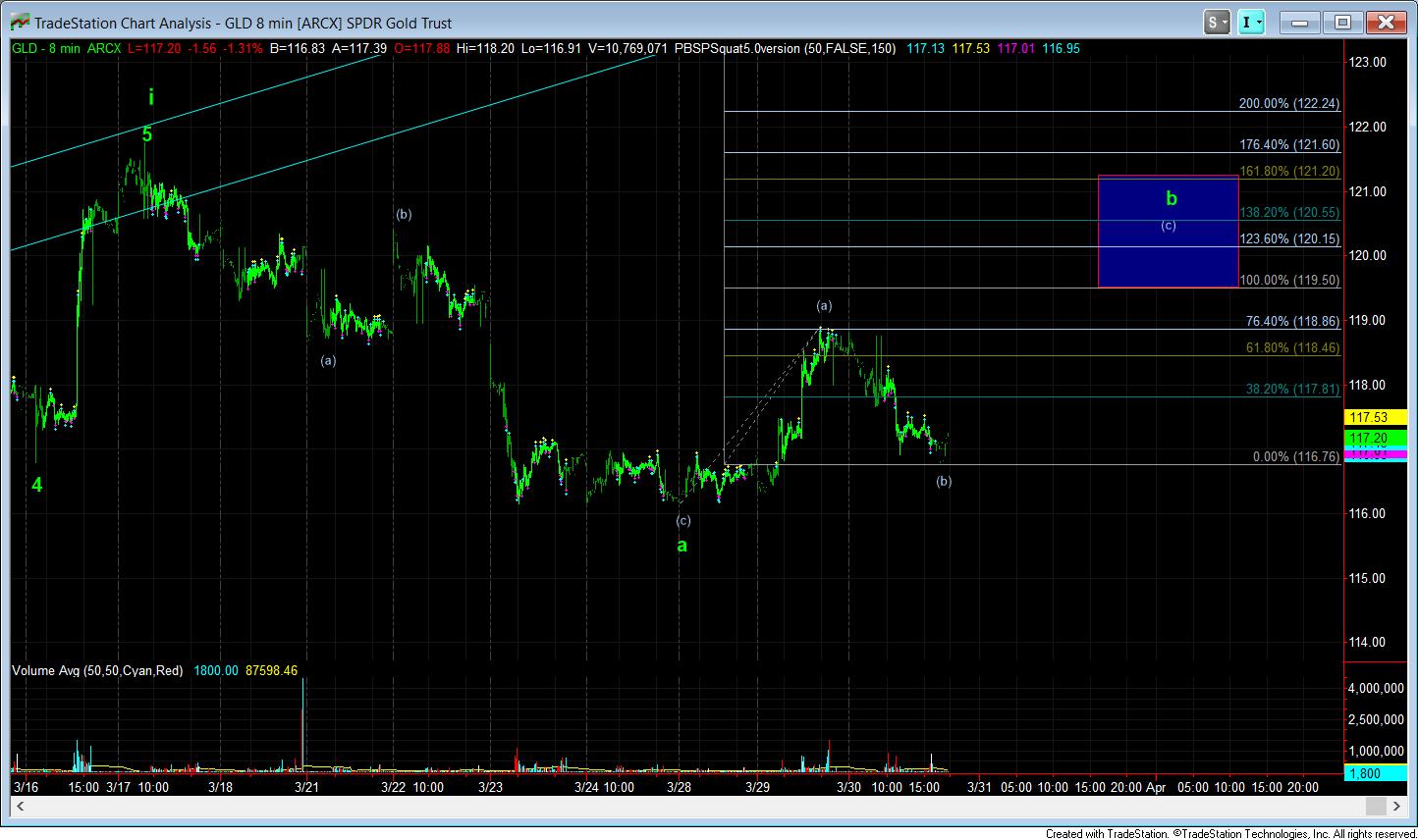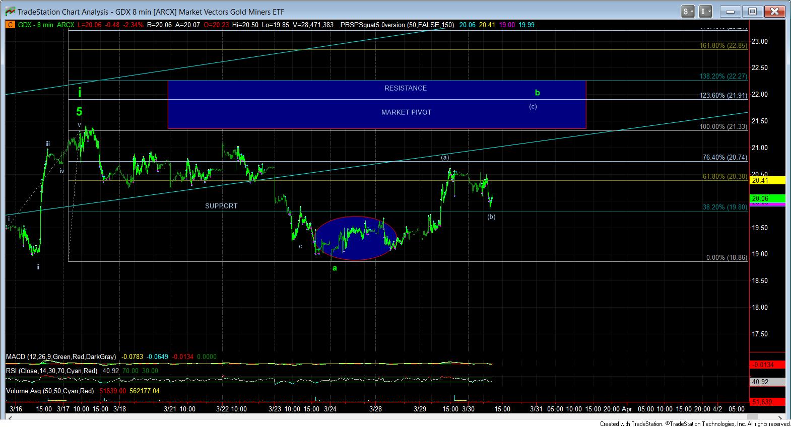 I have included a potential detailed path for the GDX and GLD, as you can see on the 8 minute charts, which also aligns well with a b-wave rise in silver. But, I must warn you that I was questioning whether to even put out a micro count, since I do not want to encourage anyone reading this to be heavily trading any patterns within a corrective structure, as they can unexpectedly morph.