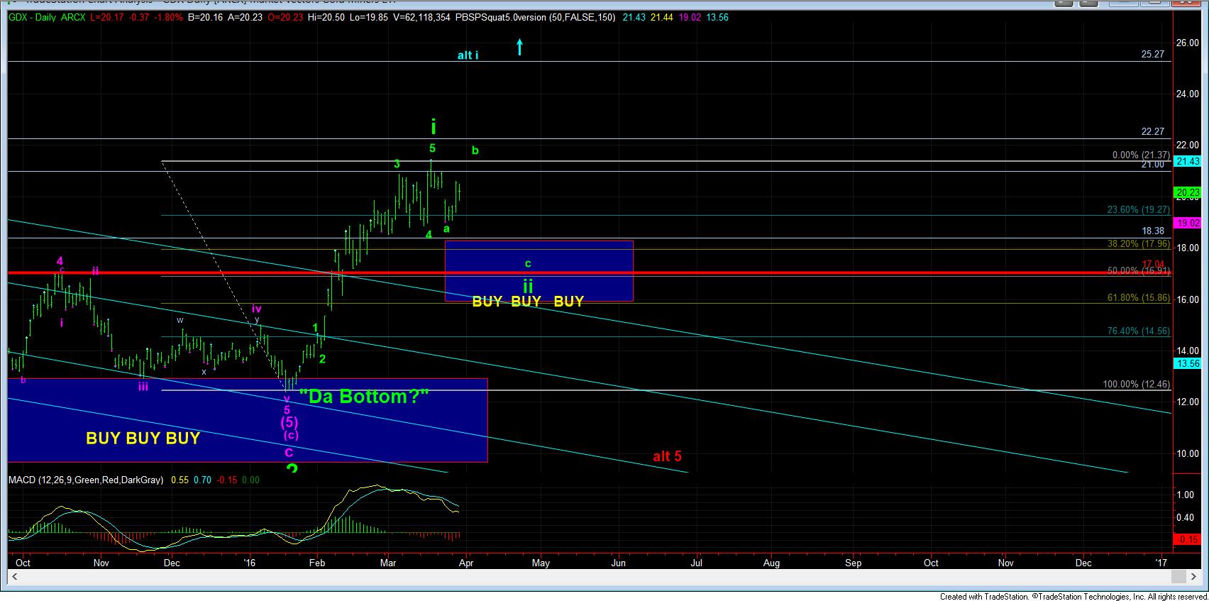 For now, I still believe it will take at least several more weeks until this wave ii completes. And, as long as the GDX remains below 22.30, I will maintain that perspective. But, should we see a break out over 22.30, then I may consider something a bit more bullish. But, for now, that is not my expectation.