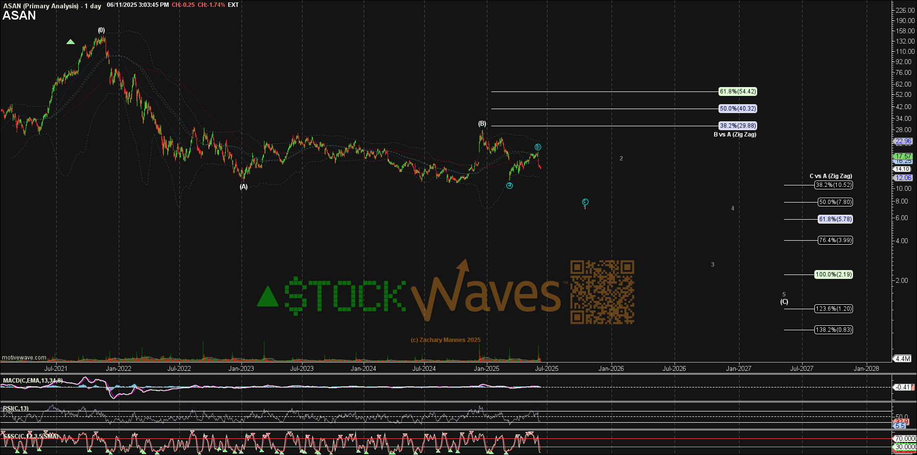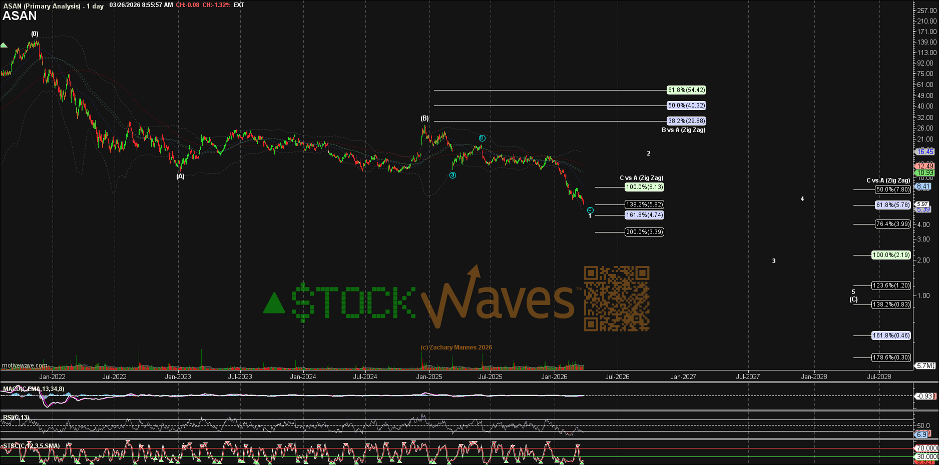 The current structure anticipates one more bounce — likely a wave 4 recovery — followed by a final decline into the target zone. That sequence, if it completes as drawn, would represent the conclusion of a corrective pattern that began when ASAN peaked above $140 in late 2021.