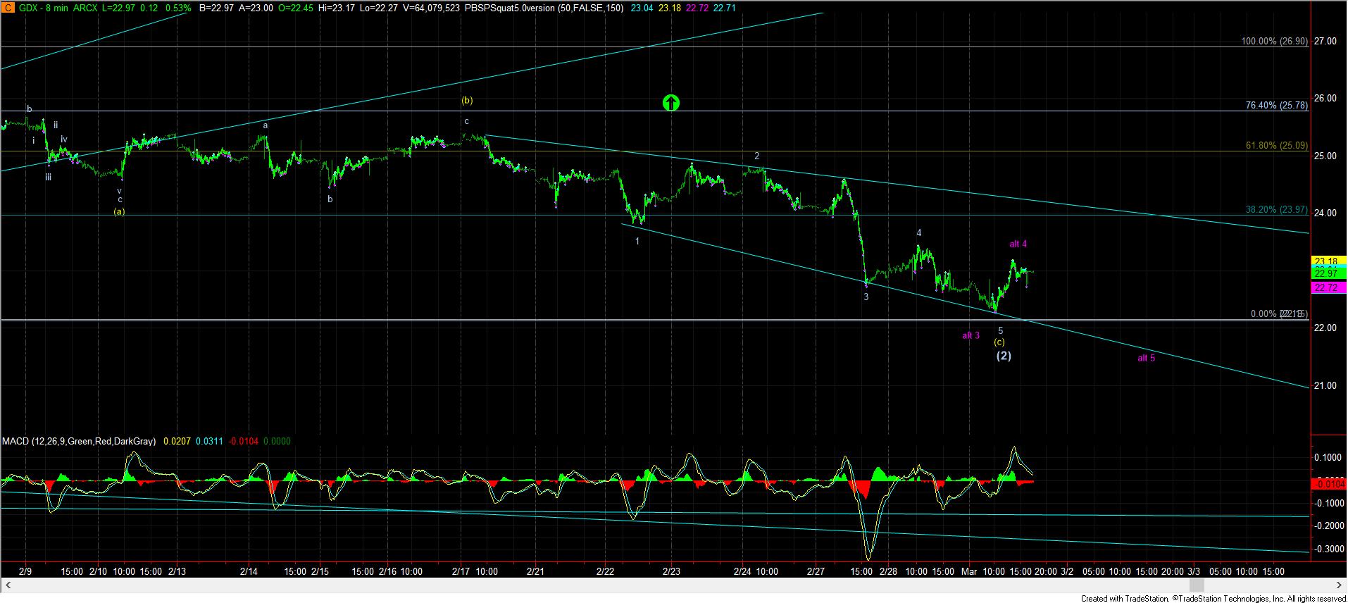Now, the GDX has been quite frustrating of late. It too has enough waves in place to consider it having bottomed. But, no 5 wave structure has been yet seen off that low. It still leaves the door open that it can drop yet again down towards the 21.50 region. But, just like the other markets, the pullback has been corrective, and if another low is seen, it seems to have a strong potential to marking the bottom to this correction, if the bottom was not already struck today. Ultimately, as long as we remain over 19.90 in the GDX, I have to maintain a strong bullish bias based upon the larger degree wave count.