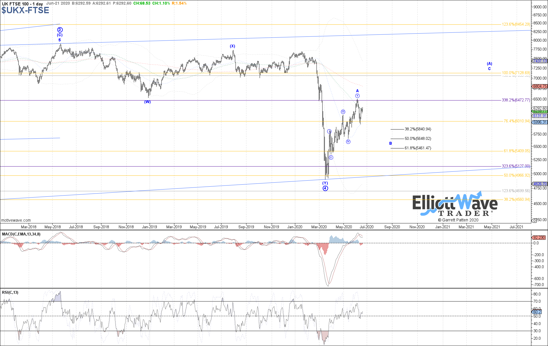 FTSE: The FTSE also started off initially lower last week, but rebounded strongly from here with price already exceeding a .618 retrace off the decline off the June high. Therefore, we are still left without clear confirmation that wave A off the March low has completed already as a leading diagonal, and instead price may want to try for one more high from here as a 5th of red wave c for a 3 wave A-wave instead. The .764 retrace at 6375 should determine the odds between these two paths, with rejection from here supporting wave B already in progress shown in blue, otherwise a sustained break above there opens the door to a new high as red wave c of A.