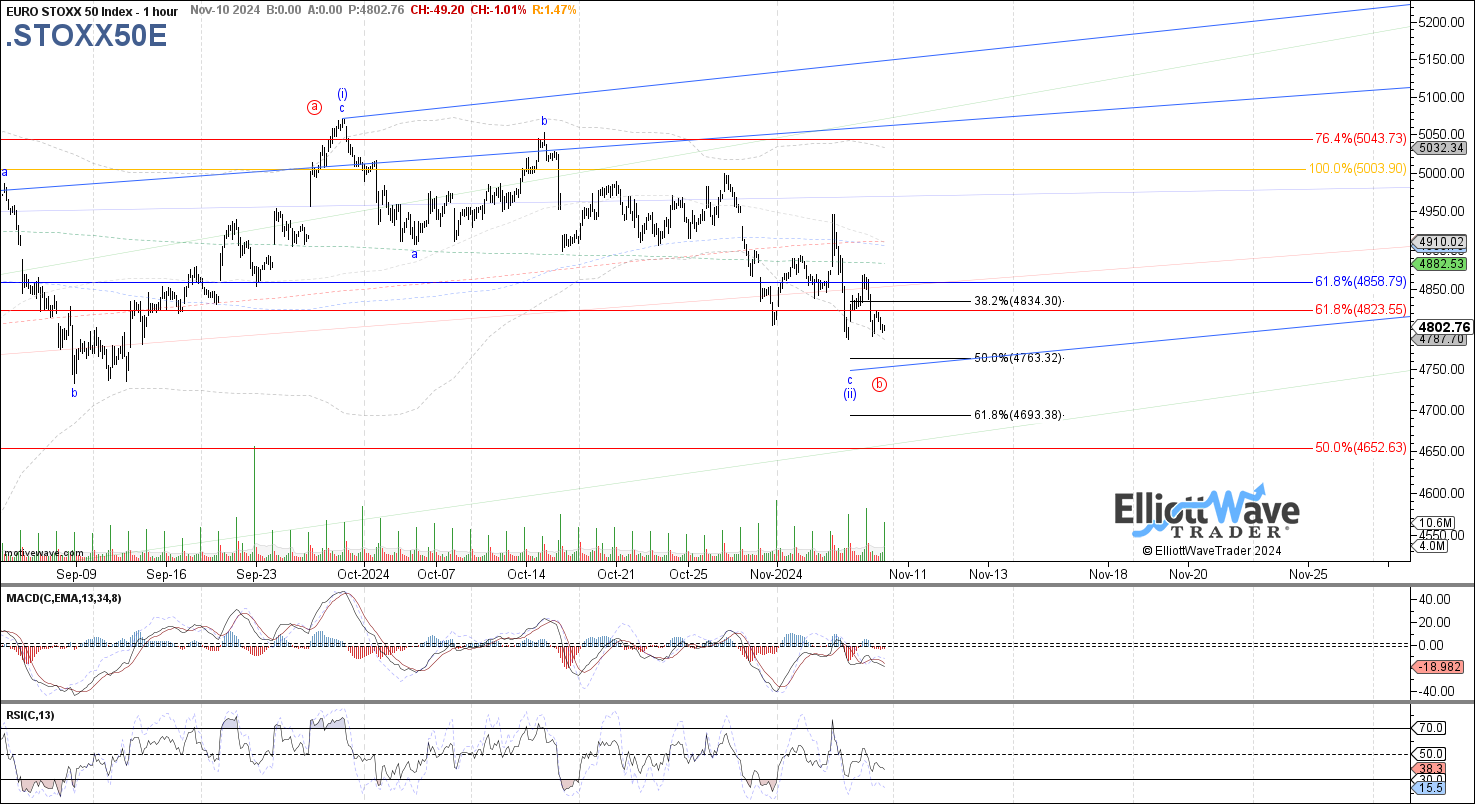 STOXX: The STOXX also started off the week initially higher but then rolled back over during the second half of the week, undercutting the October low. This suggests either a larger (i)-(ii) start to wave c of 3 in the blue count or price still working on wave b of 5 in the red count. In either case, 4765 – 4695 is the next fib support as the .500 - .618 retrace.