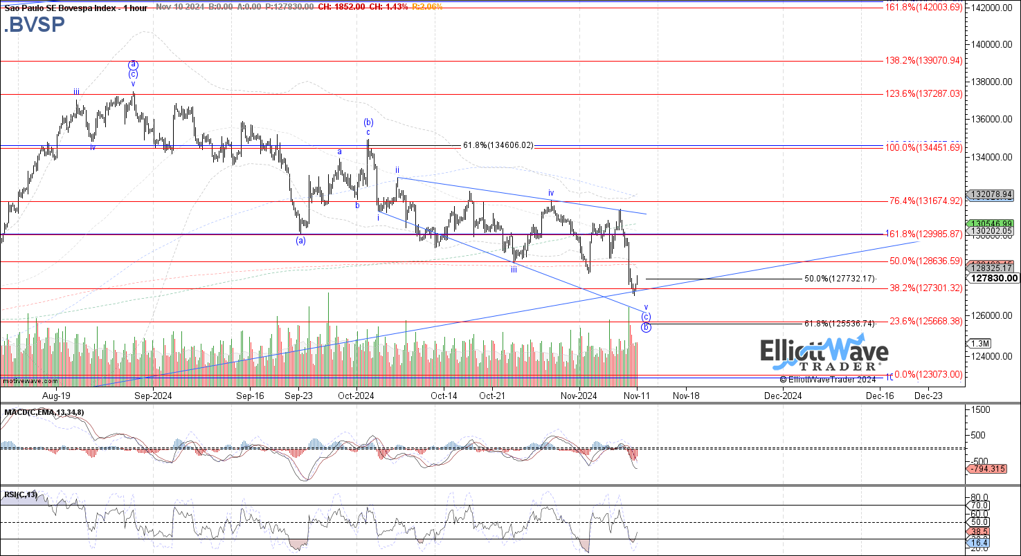 IBOV: The Bovespa started off the week initially higher, looking like price was attempting to start wave c of 5. However, it never managed to clear the previous high made the week prior, and instead ended up rolling back over to another new low on the month by the end of the week. Therefore, this at least confirms that wave b of 5 has not yet completed, with 127730 – 125535 still as the next fib support from which price can reattempt a bottom.