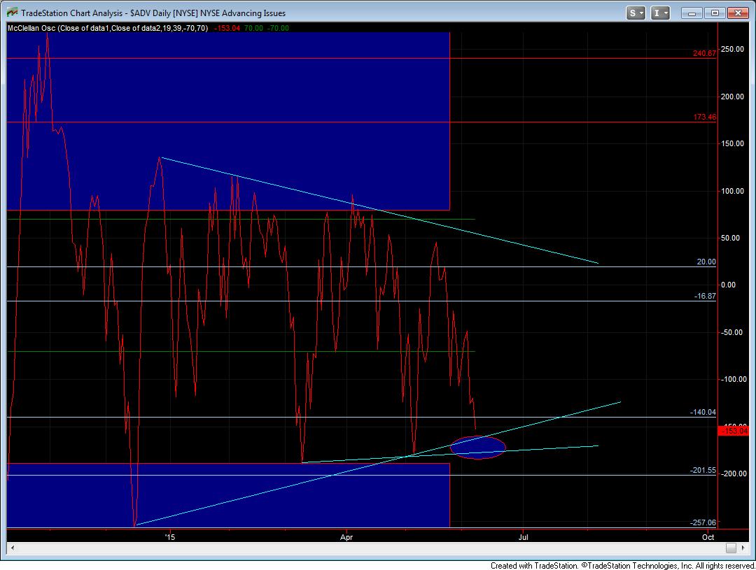 The other indication that we have been following is the McClellan Oscillator, which is now clearly at support. Ideally, we would want to see support held, and the market breaking out to the upside out of its current triangle pattern.